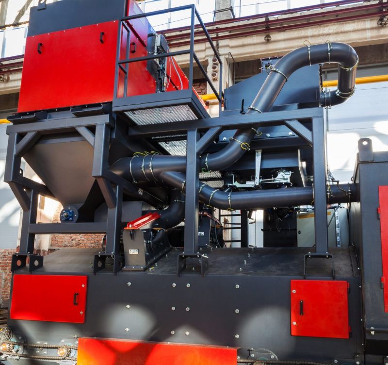 The reason for blasting the material is to remove impurities from the surface of the blasted product so that the product is ready for subsequent painting. During blasting, rust particles, old paint and other impurities are released into the blasting area. These dust particles are sucked out and separated by a filter system. When blasting aluminium products, aluminium dust may be extracted and form an explosive mixture with the air, and the filter system is therefore equipped for the extraction of explosive dusts.