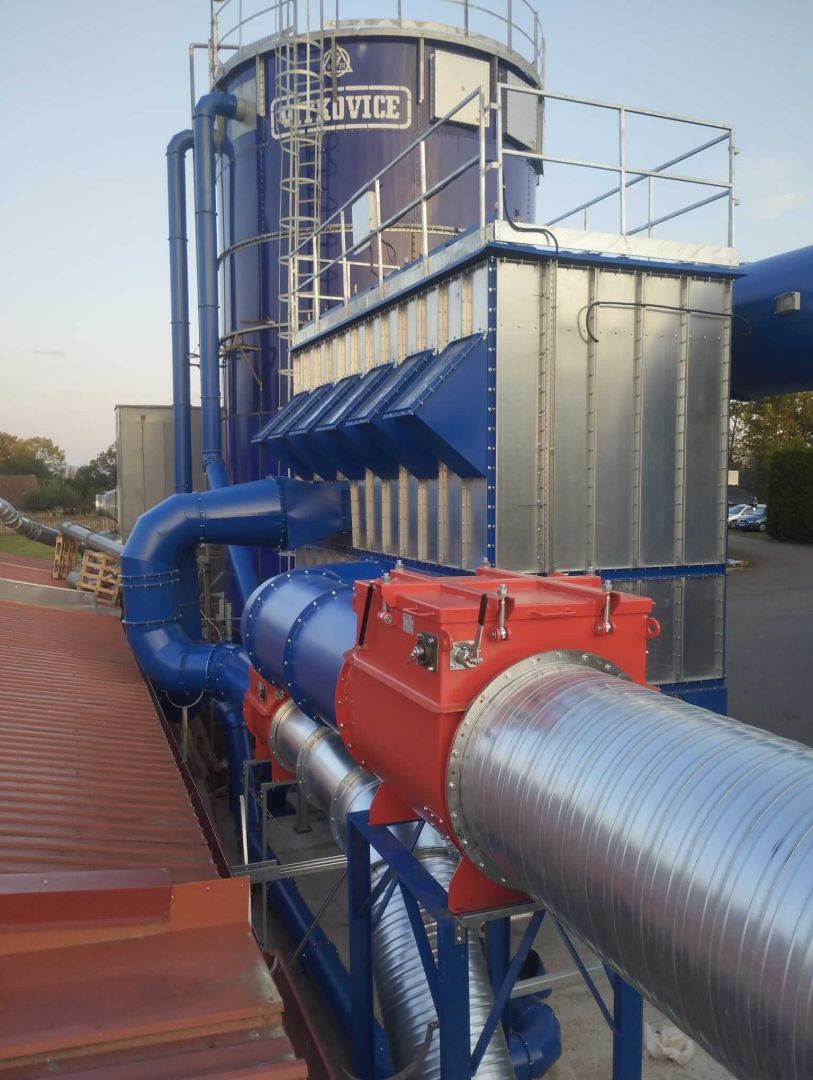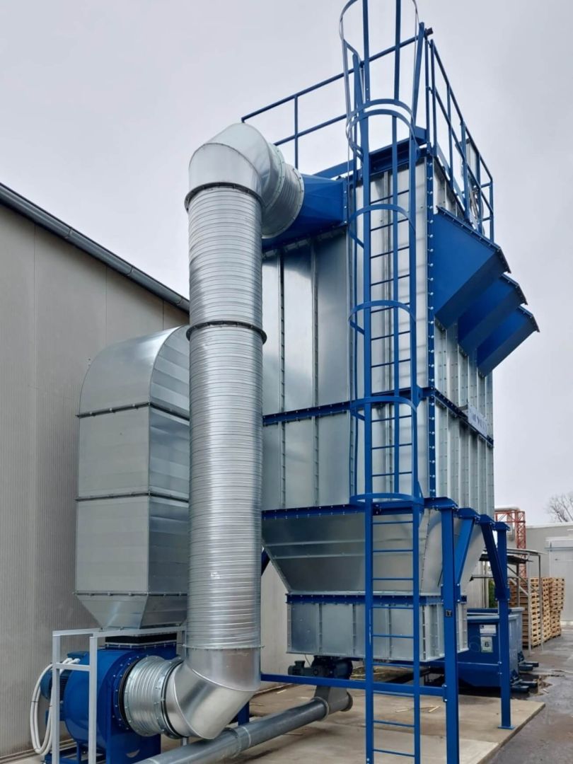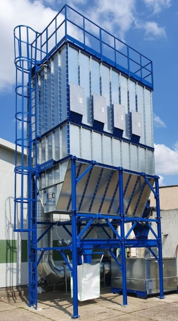 The subject of our order was the manufacture of two filter units for sawdust extraction from wood production. The filtration units are mounted on a supporting steel structure also of our manufacture. One filter unit of positive pressure construction and one unit of negative pressure construction were used for the extraction concept corresponding to the investor's requirements. In both cases, the filter units are equipped with a pressure wave release system for the extraction of explosive dust to the outside environment. The filter units were manufactured for our partner GreMi KLIMA, s.r.o., which is the general supplier of the sawdust extraction system for the end client.