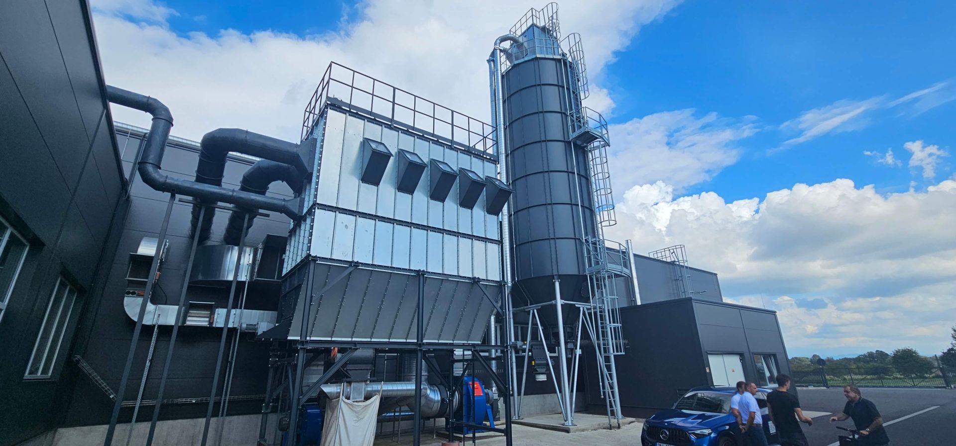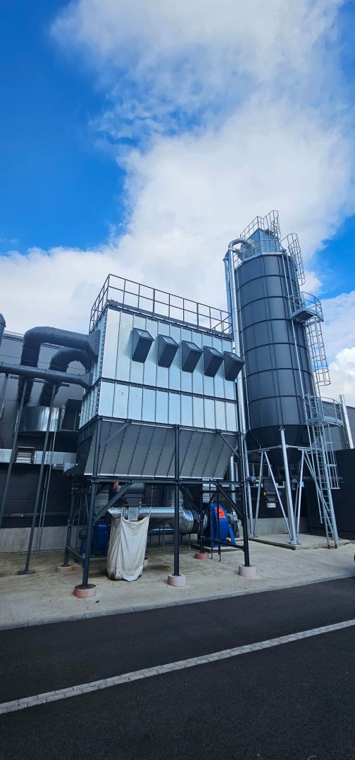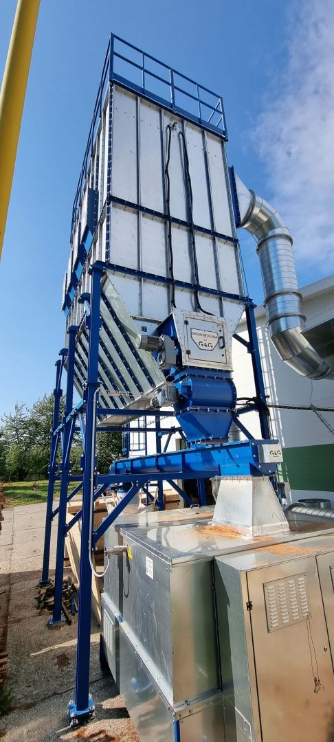 In woodworking, where large amounts of shavings and sawdust are generated, it is essential to ensure the continuous removal of material from the machines to prevent waste from accumulating near the tools and unnecessary dusting in the workshop. For this project, we selected the G&G Flat WOOD filtration system in a modular design. The entire system is located outdoors on a steel support structure.